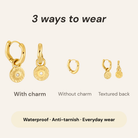 Designed for those who enjoy jewellery that feels versatile yet uncomplicated, these earrings can be worn in three different ways. Wear the hoops on their own for a clean, minimal look, add the sun charm for subtle character, or combine them with other small earrings for layered styling.