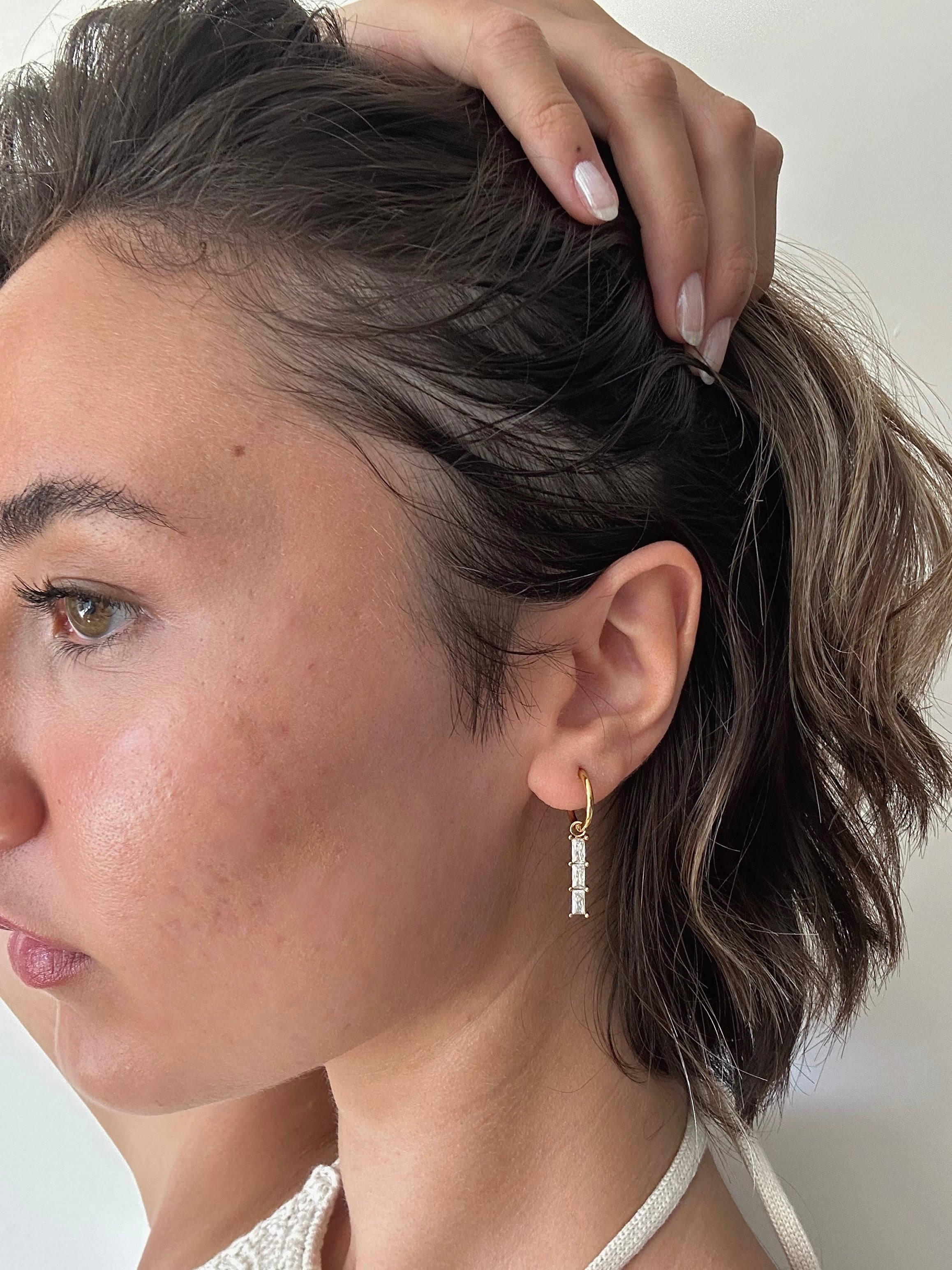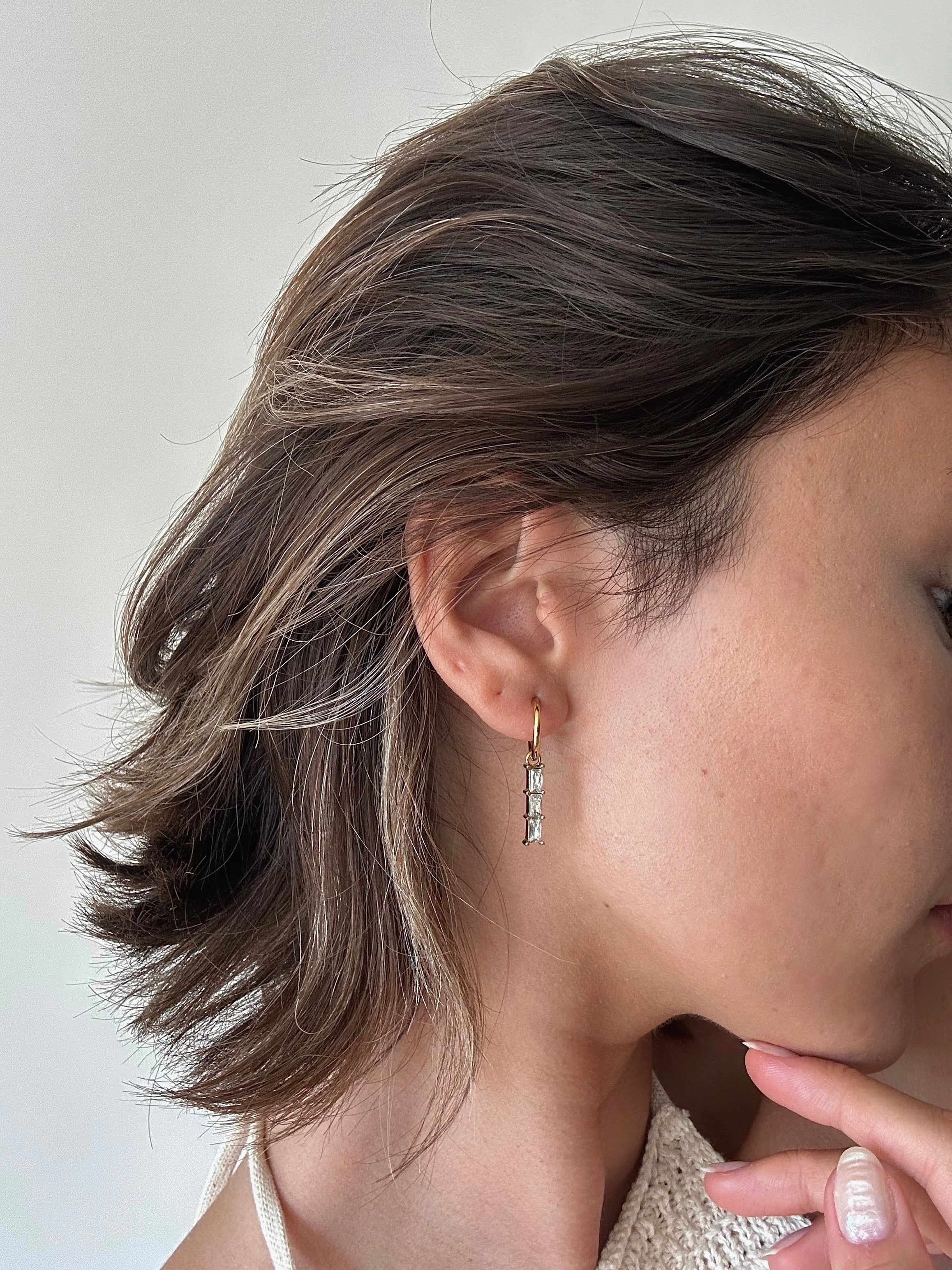 Make a statement with these Baguette Long Drop Earrings. The sparkly cubic zirconia baguette charm is detachable, allowing you to wear the hoops alone or with the charm for a more elevated look. These earrings are super light and comfortable to wear, perfect for adding some glamour to your party wear or elevating your everyday ear stacking look.