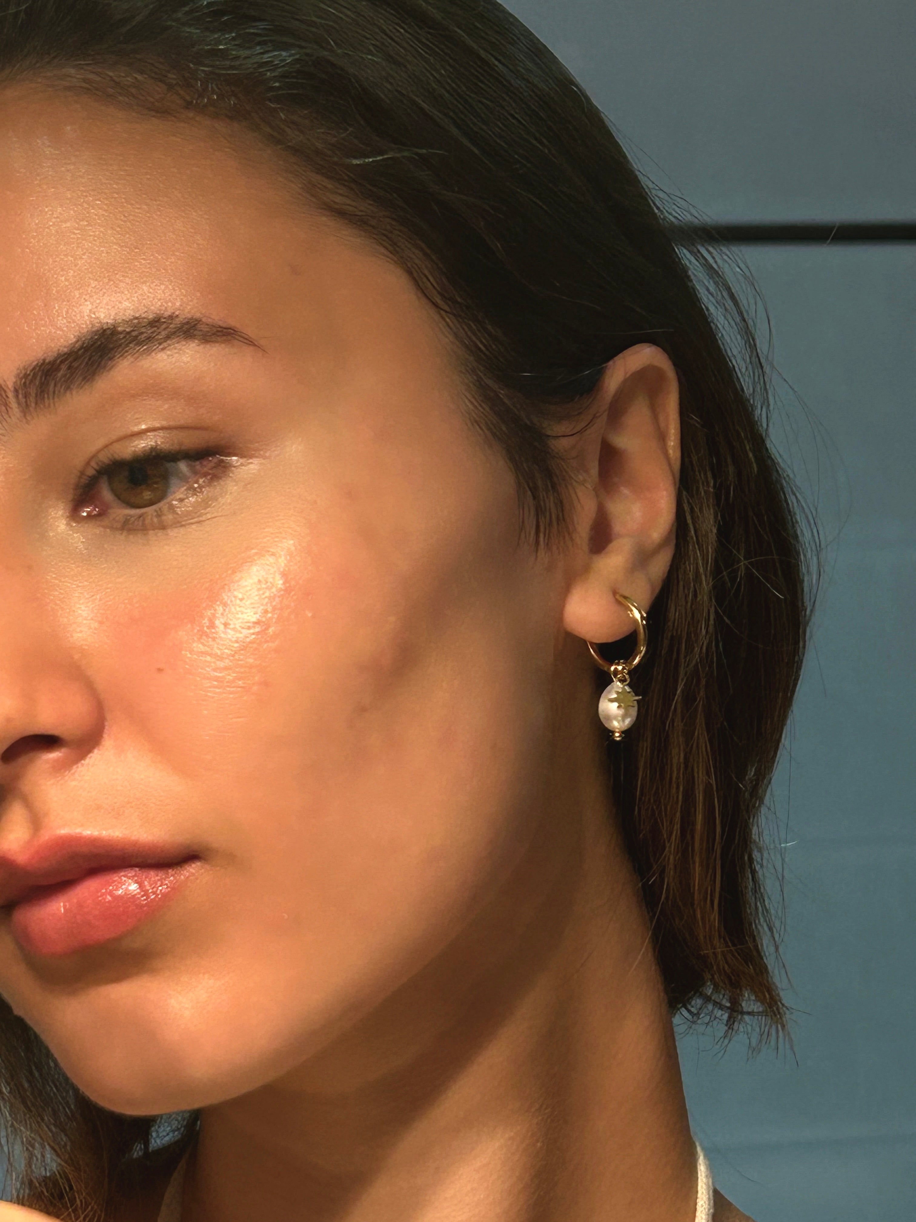 Introducing our stunning pearl and star charm hoop earrings - a versatile addition to your everyday or special occasion jewelry collection. These hoops are perfect for ear stacking and can be worn alone or with the detachable star or pearl charms.