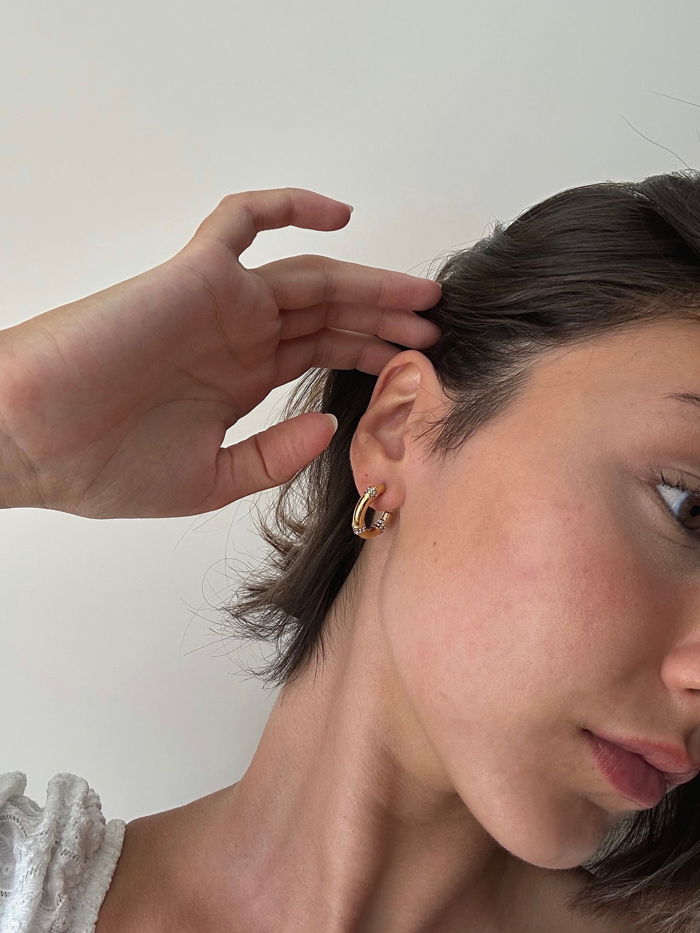 The medium-sized hoops are the perfect ear stacking essential, adding a unique and trendy touch to any outfit. The sparkling cubic zirconia stones add a touch of elegance and sophistication, making these earrings the ideal choice for anyone looking to make a statement.